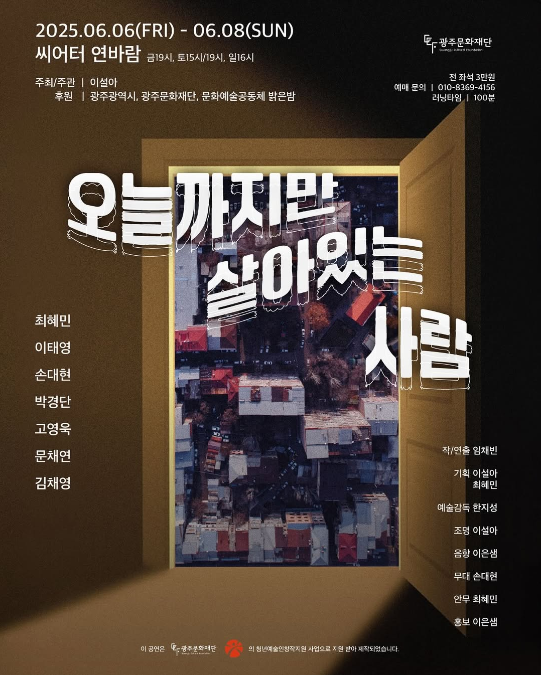 학동 참사 4주기 추모 연극 “오늘까지만 살아있는 사람”"당신이 가장 행복했던 순간은 언제입니까?" 무너진 건물 아래 멈춰버린 시간, 광주 학동 참사 4주기를 기억하는 연극이 돌아왔습니다. 2021년, 철거 중 붕괴된 학산빌딩. 9명이 희생된 그날을 잊지 않기 위해,극단 밝은밤이 4년째 추모 무대를 엽니다. 이번 작품 은 ‘이승과 저승 사이’, 기억이 교차하는 공간 ‘어중’을 무대로, 죽은 자들의 잃어버린 기억과남겨진 사람들의 상처를 이야기합니다. 북한이탈주민, 병든 아이, 사자와 신비한 존재까지 현실과 판타지가 섞인 이 세계는단지 추모를 넘어서, 반복되는 참사에 ‘멈춤’을 요구합니다. 우리가 기억하지 않으면, 또 무너집니다작은 관람이 큰 위로가 됩니다. - 일시: 2025.6.6.(금) ~ 6.8.(..