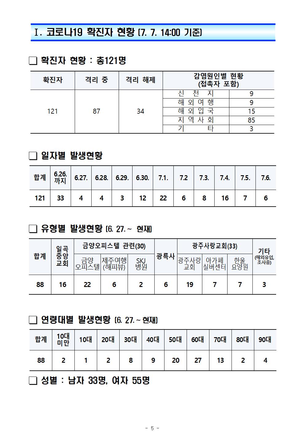 로나19 확진자가 어제 6명 추가되어 오늘 현재(14시) 총 누적 확진자는 121명입니다. 지난 6월27일부터 오늘까지 10일 동안 확진자 88명이 추가발생했습니다. (해외입국자 2명 포함)