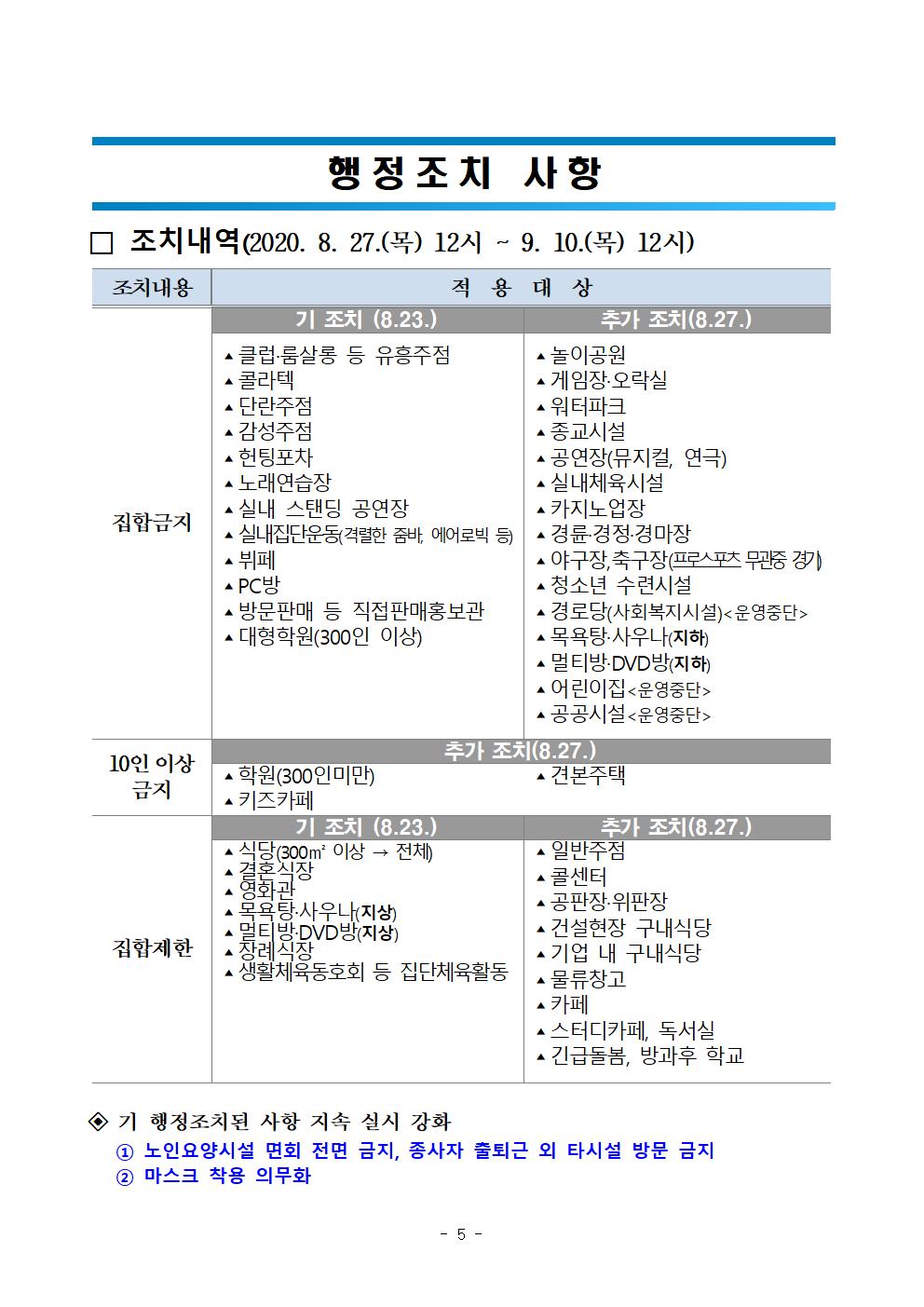 따라서 광주광역시 코로나19 민관공동대책위원회는 사회적 거리두기 2단계를 유지하면서, 사실상 3단계에 준하는 집합금지 확대 등의 조치를 취하였습니다. ※행정명령 발령기간 : 8월27일 12시~9월10일 12시