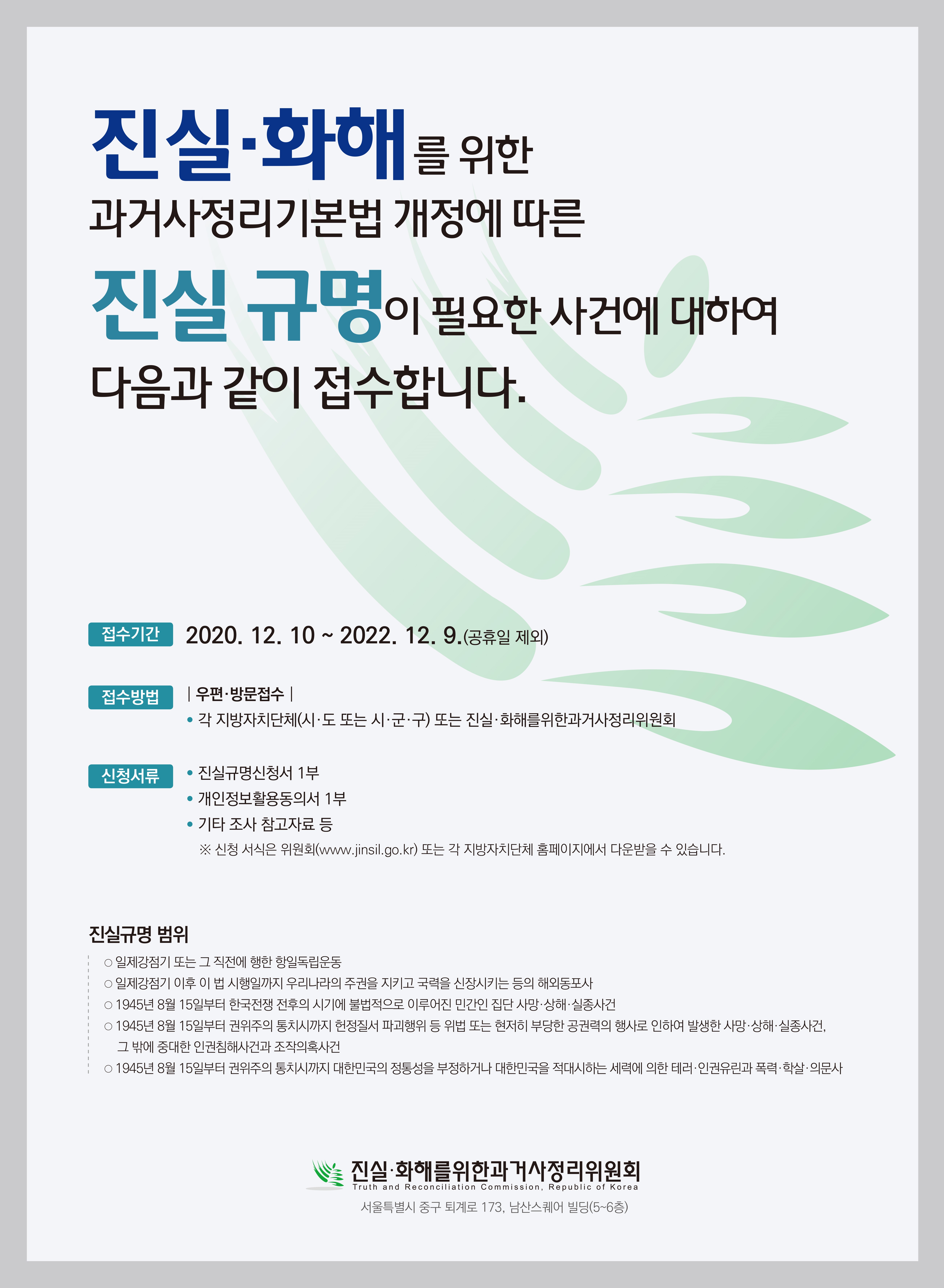 10일부터 시행되는 ‘진실·화해를 위한 과거사정리 기본법 개정안’에 따라 실시하는 이번 접수는 항일독립운동, 반민주·반인권적 행위에 의한 인권유린 등을 조사해 왜곡되거나 은폐된 진실을 밝혀냄으로써, 과거와의 화해를 통해 미래를 향한 국민통합에 기여하기 위한 취지다.