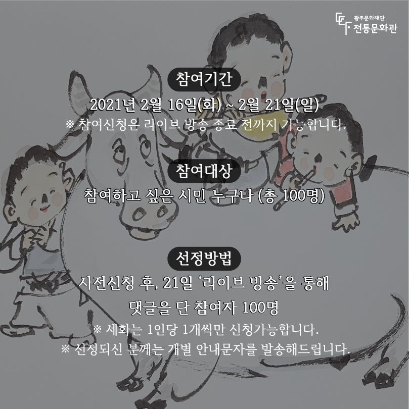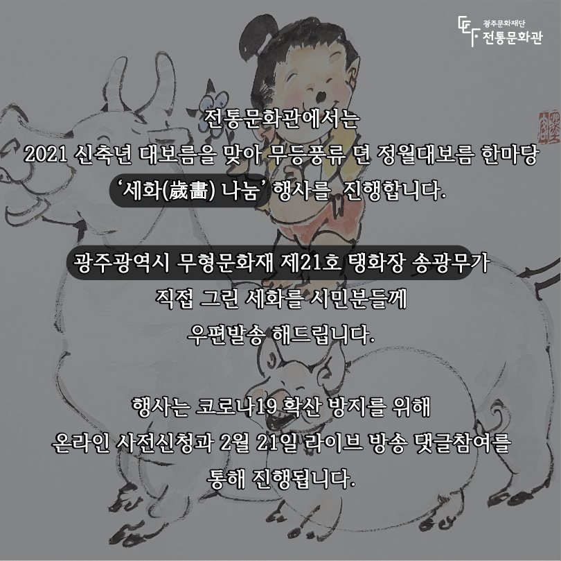 2021 신축년 대보름을 맞아 무등풍류 뎐 정월대보름 한마당 ‘세화(歲畵) 나눔’ 행사를 진행합니다.