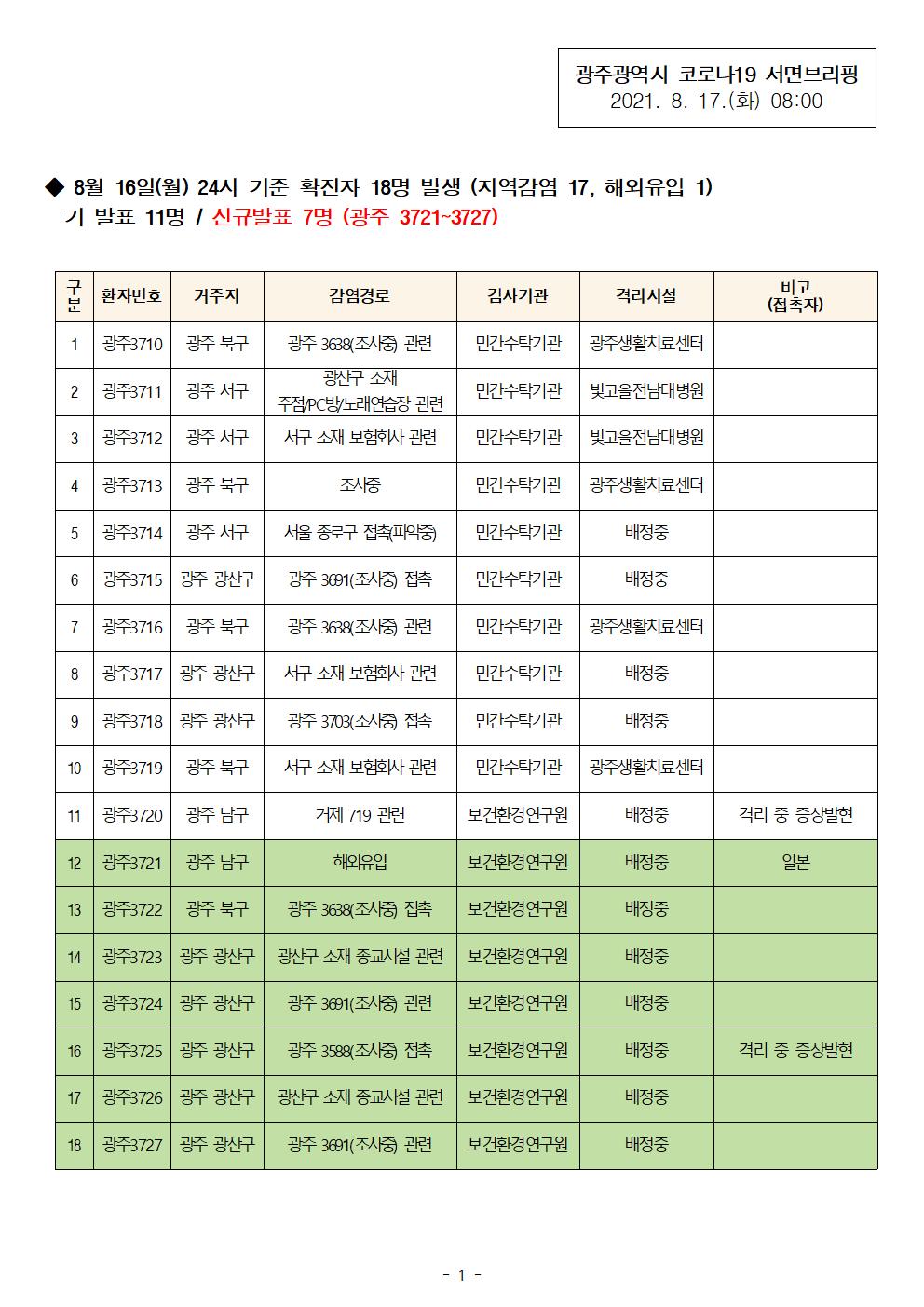 ◆ 8월 16일(월) 24시 기준 확진자 18명 발생 (지역감염 17, 해외유입 1)