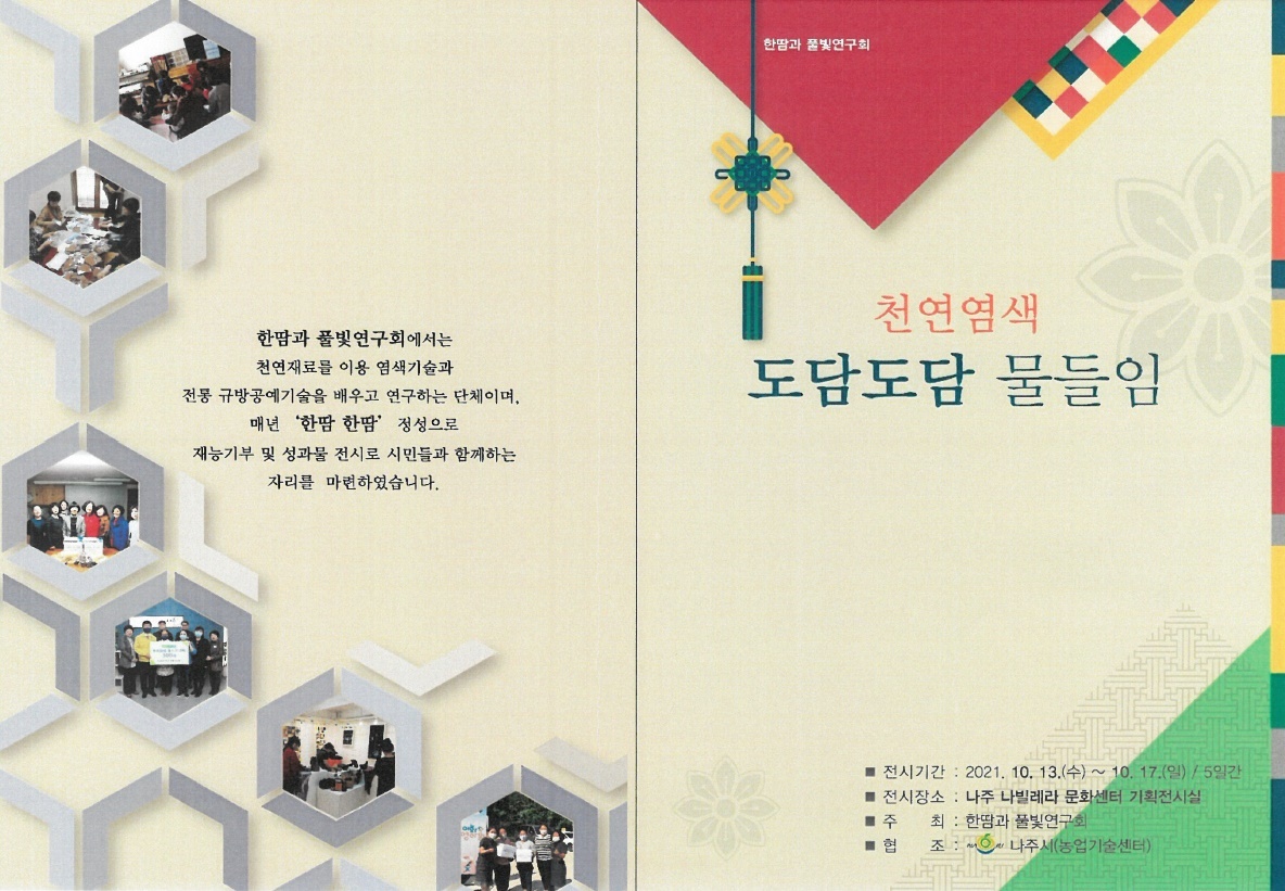 나주시는 ‘천연염색 도담도담 물들임’이라는 주제로 오는 13일부터 17일까지 5일 간 나빌레라문화센터 기획전시실에서 한땀과 풀빛연구회 작품 전시회가 열린다고 7일 밝혔다.