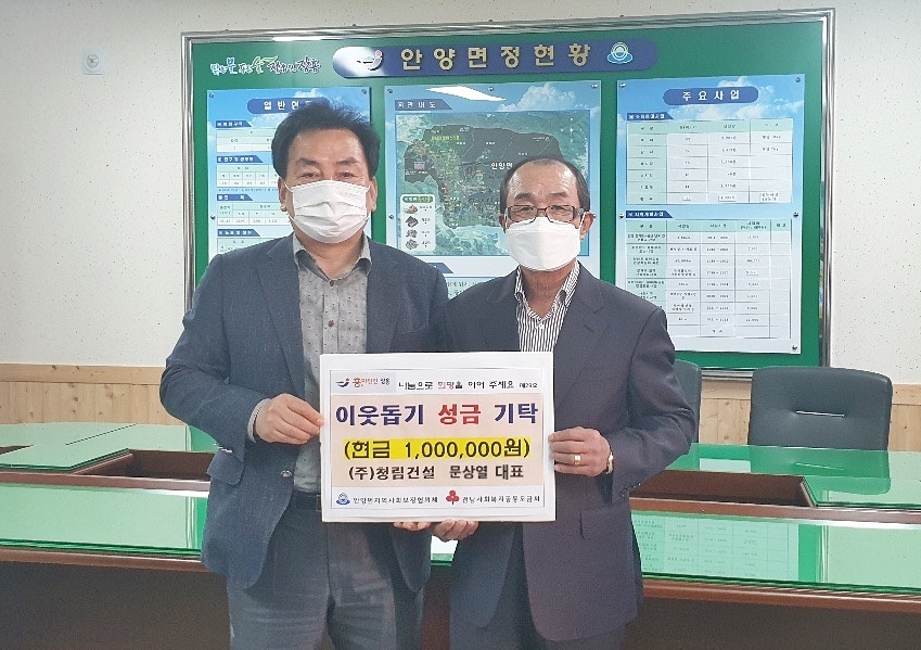 ㈜청림건설(대표 문상열)은 지난 10월 29일 안양면 행정복지센터를 방문하여 취약계층을 위해 써 달라며 성금 100만 원을 기탁했다.