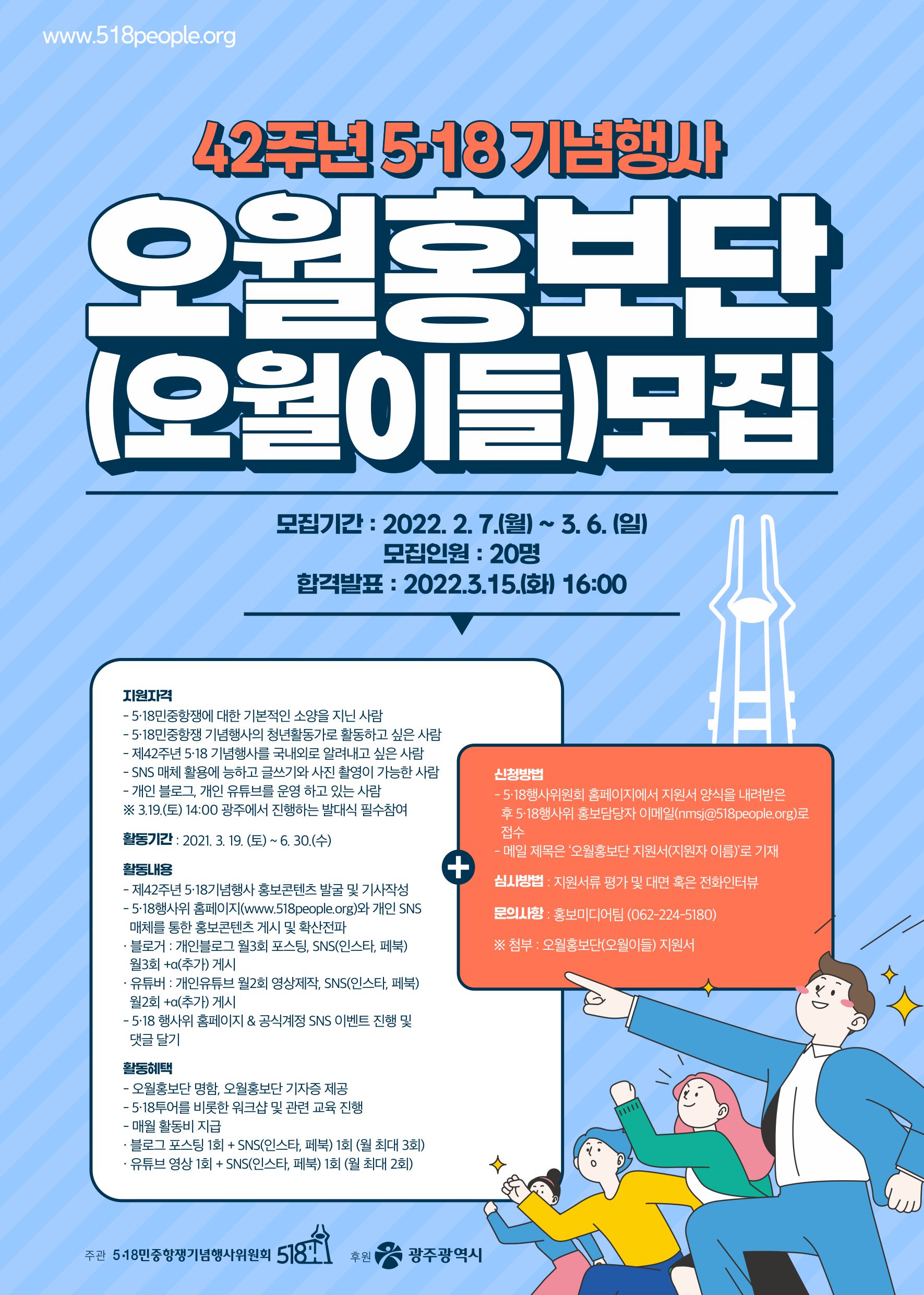 오월홍보단 지원 자격은 5·18민중항쟁 정신을 계승하고 청년활동가로 활동하고 싶은 사람, 42주년 기념행사 홍보와 참여를 유도할 수 있는 사회관계망(SNS) 매체를 활용할 수 있고, 글씨기와 사진촬영이 가능한 개인블로그, 유튜브 등을 운영하는 개인이며, 각각의 활동에 따른 활동비가 지급된다.
