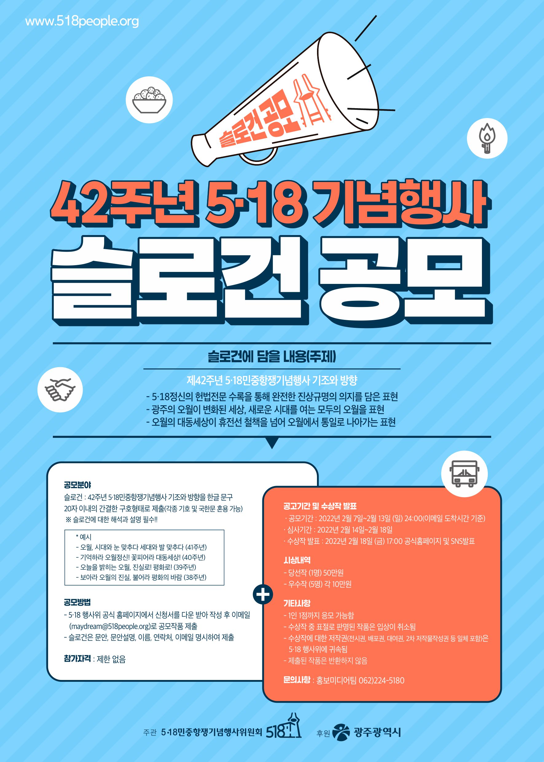 광주광역시는 518민중항쟁기념행사위원회(이하 ‘518행사위’)8일부터 28일까지 42주년 기념행사 표어(슬로건)을 접수한다고 밝혔다.