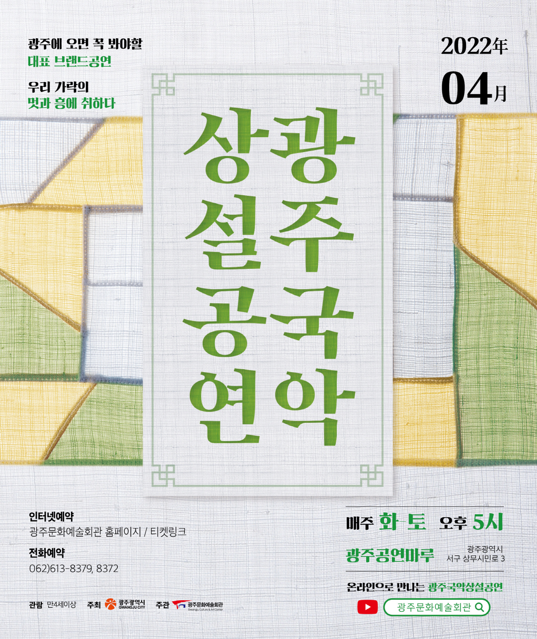 광주문화예술회관은 4월부터 올해 공모를 통해 선발된 민간예술단체와 시립예술단이 매주 화요일부터 토요일 오후 5시 광주공연마루에서 광주국악상설공연 을 선보입니다.