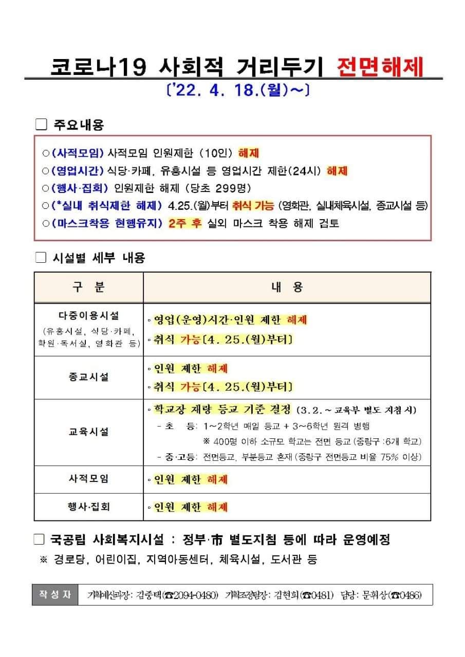 또한 영화관·실내체육시설·종교시설 등 실내 다중이용시설에서의 음식물 섭취 금지조치도 4월 25일부터 모두 해제 됩니다.