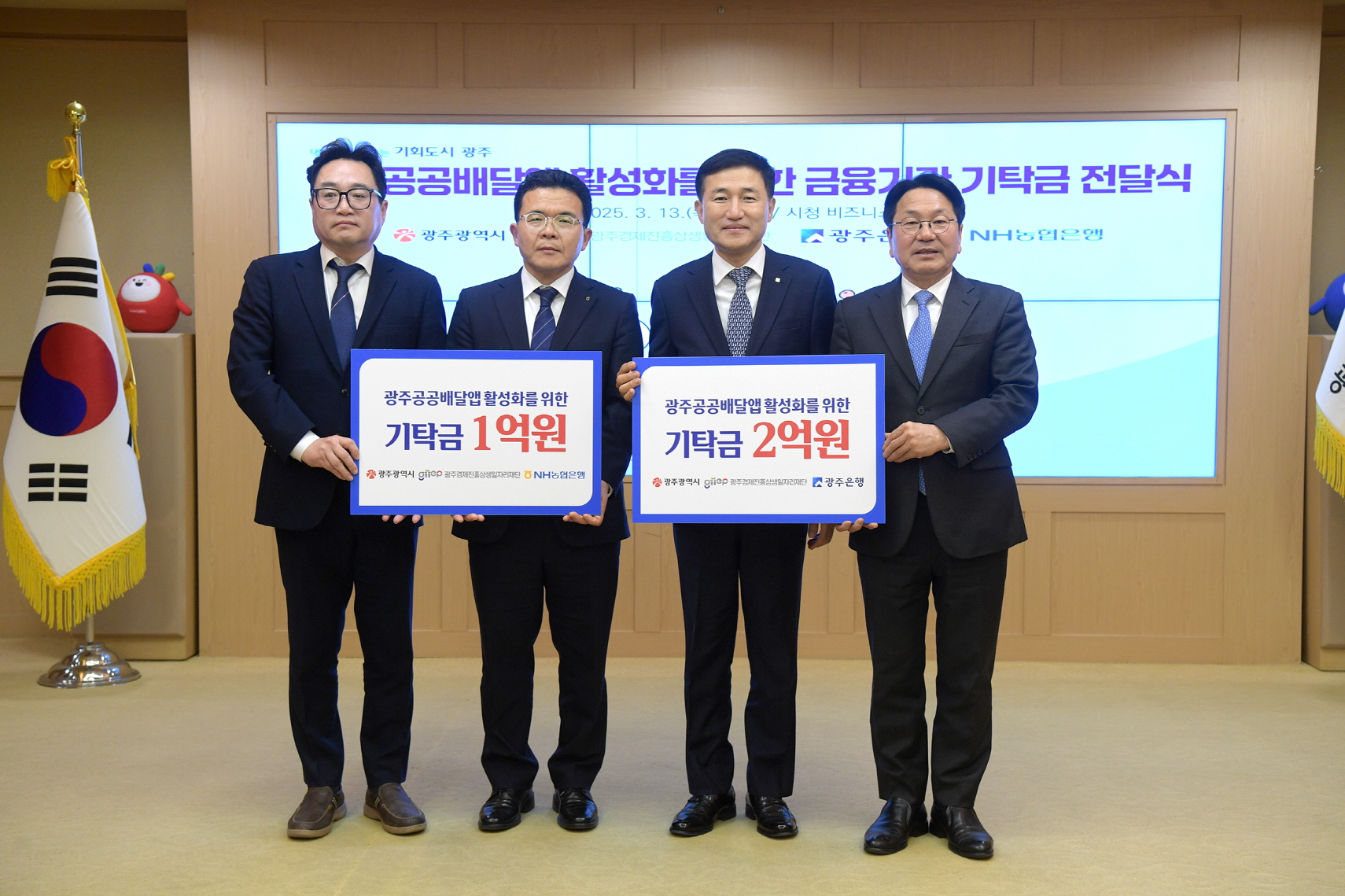 지난 13일 광주광역시청에서 열린 기탁금 전달식에는 강기정 광주시장, 고병일 광주은행장, 장재영 NH농협은행 광주본부장, 김현성 광주경제진흥상생일자리재단 대표이사가 참석해 공공배달앱 활성화의 의미를 되새겼습니다.