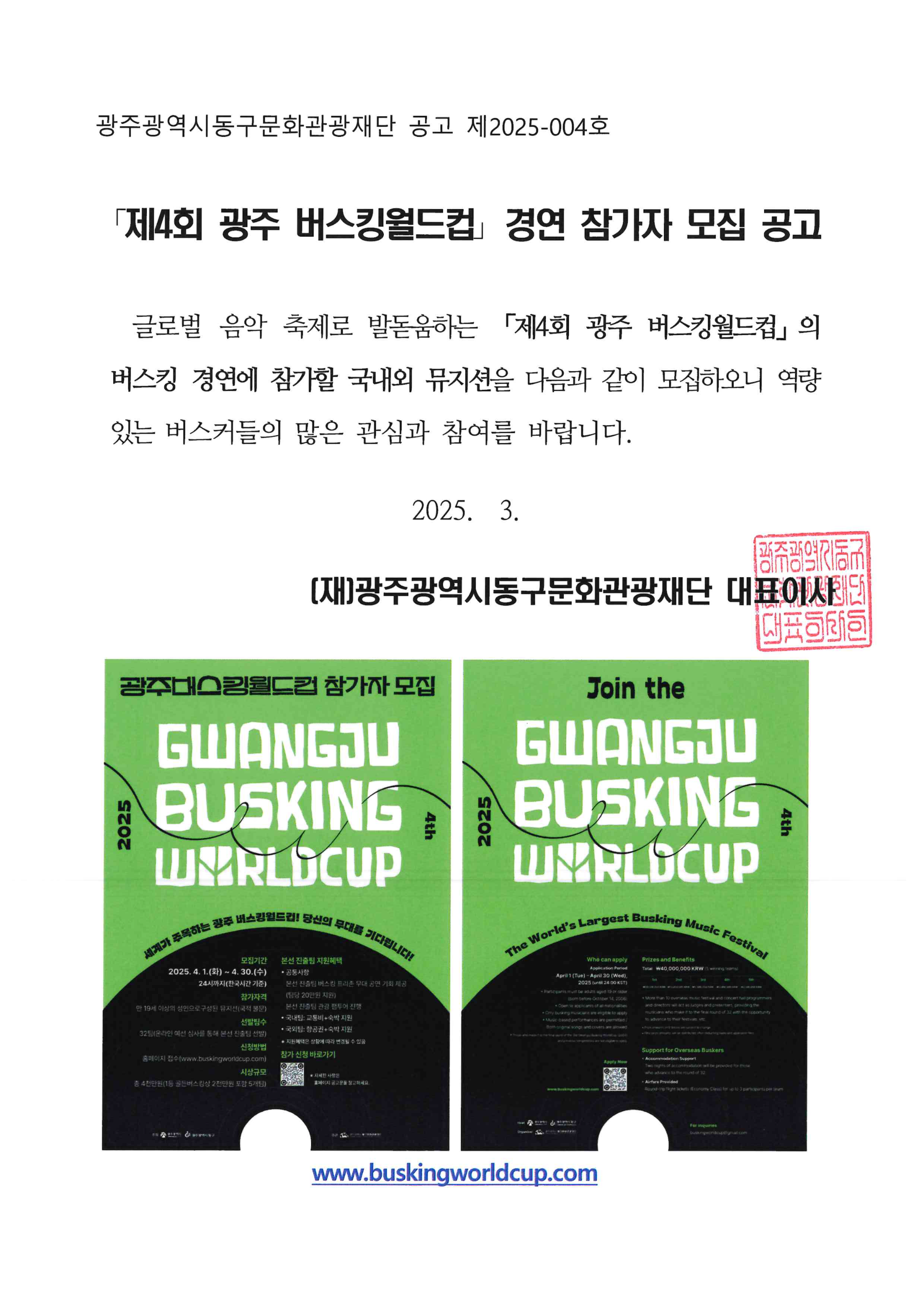 - 공식 홈페이지 접수: www.buskingworldcup.com