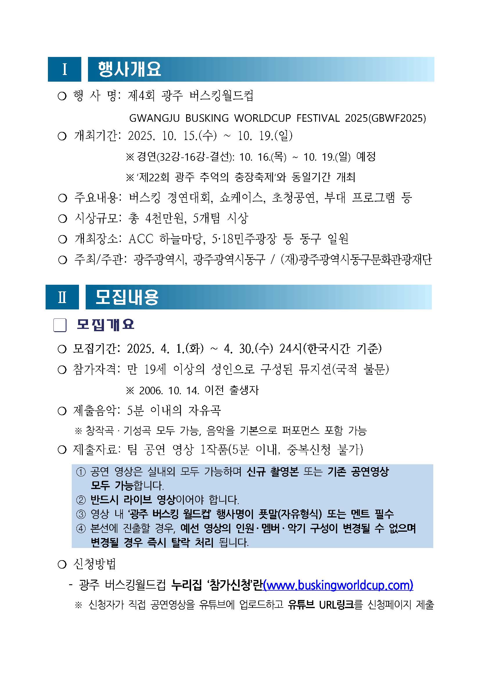 - 영상에는 반드시 ‘광주 버스킹 월드컵’ 문구 포함 (멘트 or 푯말)