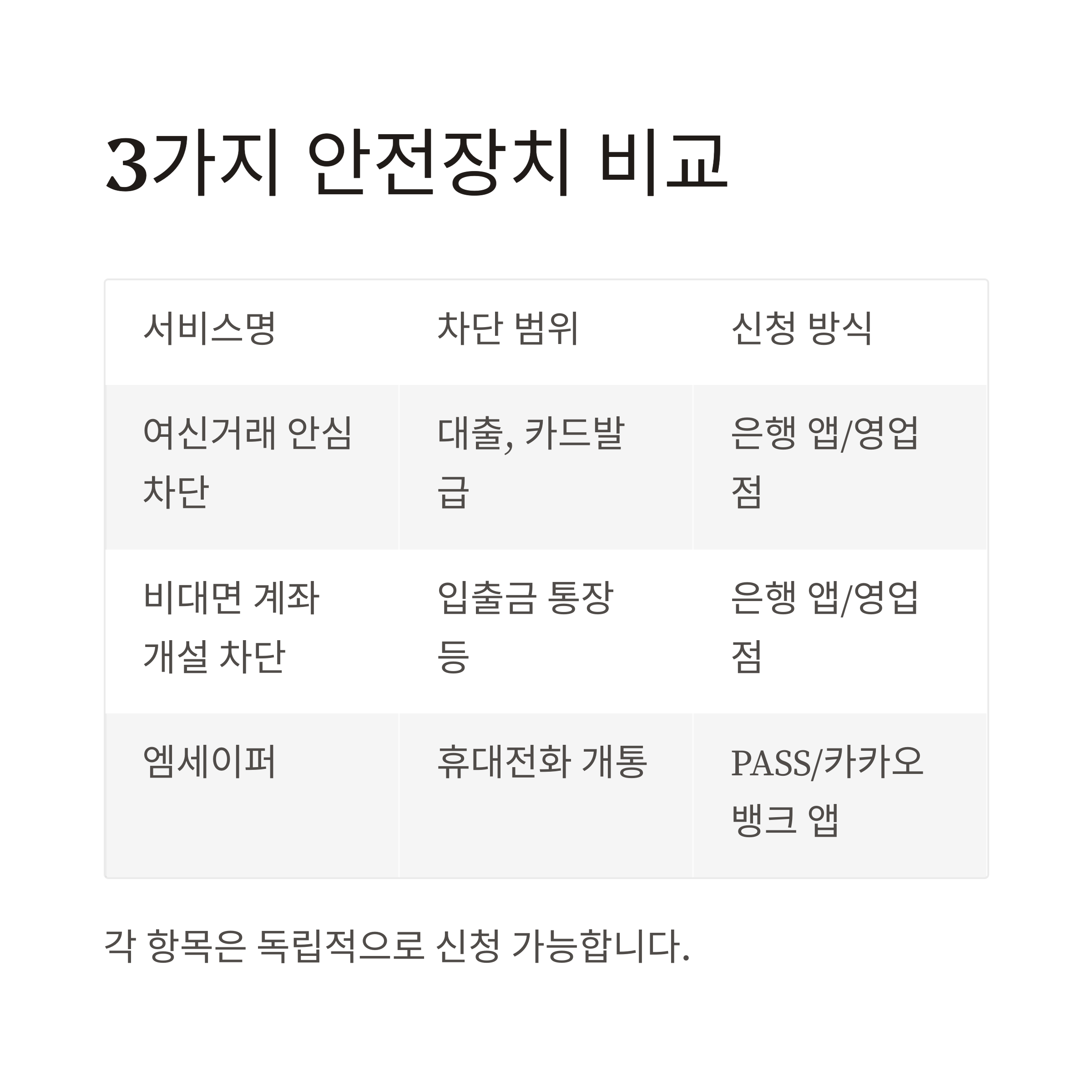 | 여신거래 안심차단 | 대출, 카드발급 등 | 은행 앱 / 영업점 방문 | 영업점 방문 필수 |