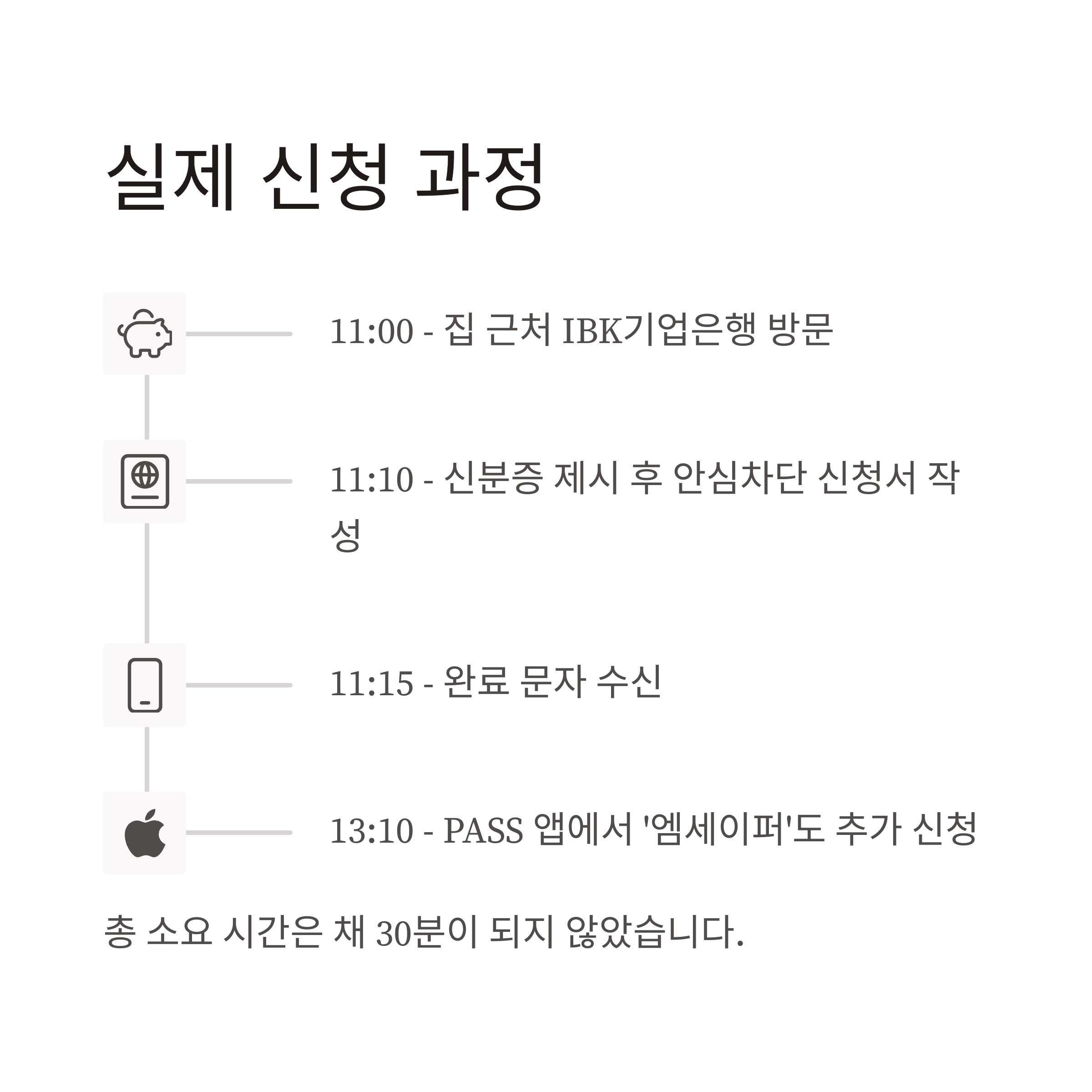 - 13:00 → 집에서 은행 앱 접속해 온라인으로도 신청 확인