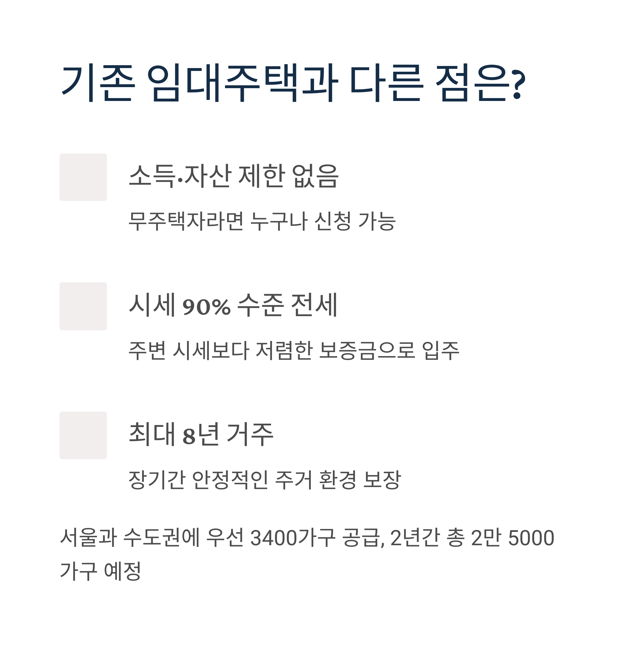 기존 임대주택과는 차별화된 획기적인 제도입니다. 이번에 서울과 수도권에 우선 공급되는 3400가구는